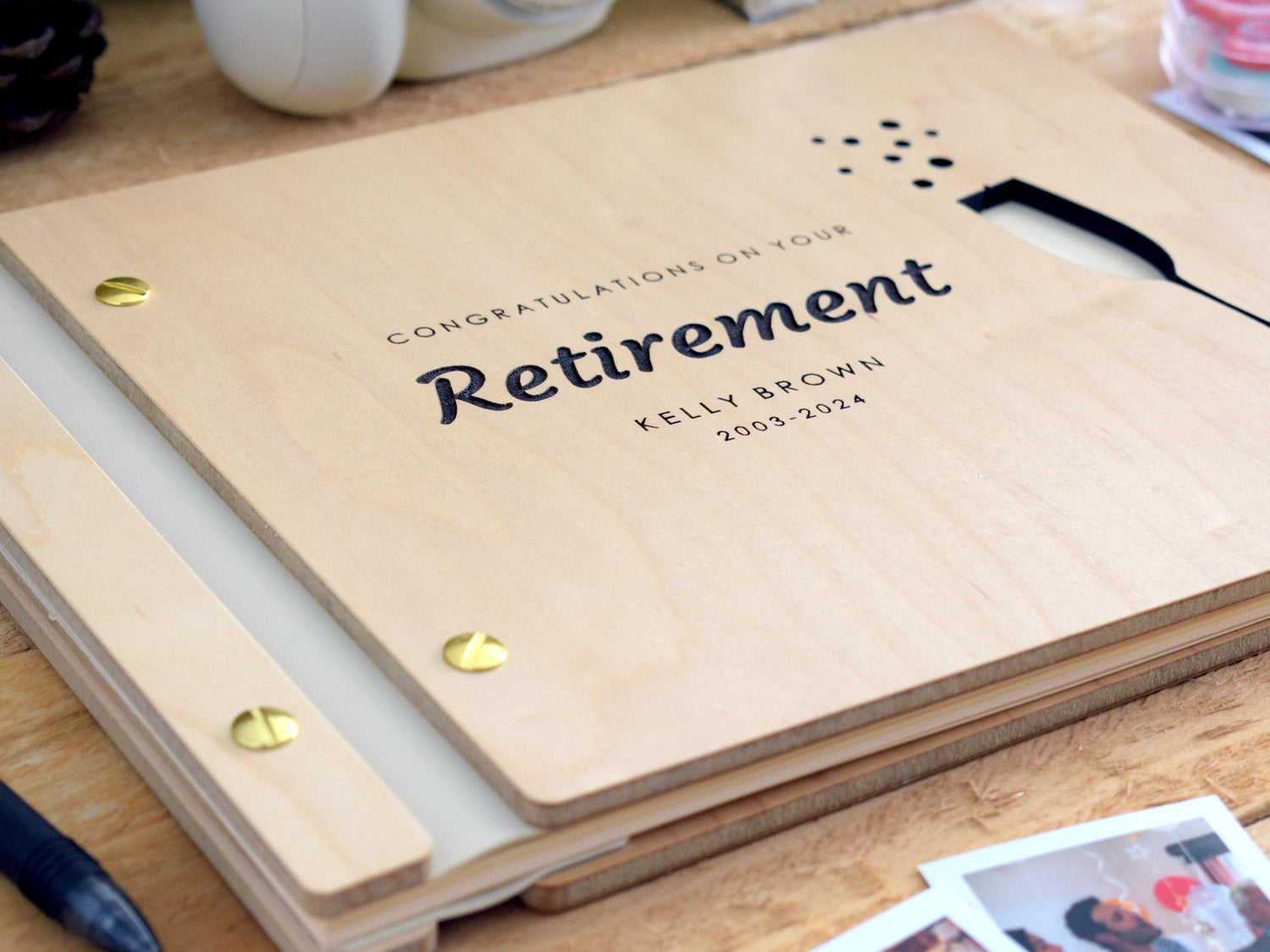 Celebrate the milestone of retirement with our beautifully handcrafted wooden guest book,...