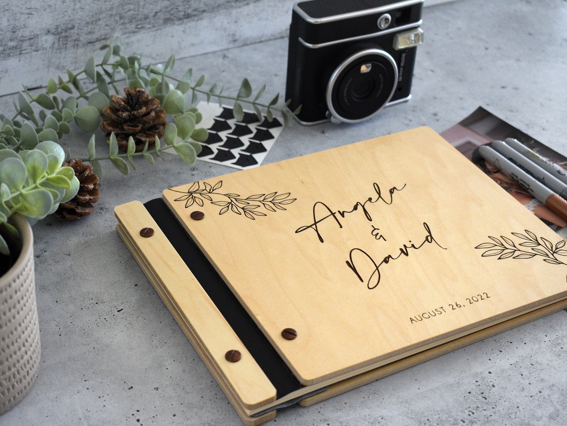This custom wedding guest book features a beautifully engraved design, perfect for capturing memories at weddings, engagements, and other events. Each book is laser engraved with your unique details, making it a one-of-a-kind keepsake. Display it at your wedding, bridal shower, or event for guests to sign and add Polaroid photos. Ideal for creating a Polaroid-style photo album, these guest books make excellent wedding and engagement gifts.